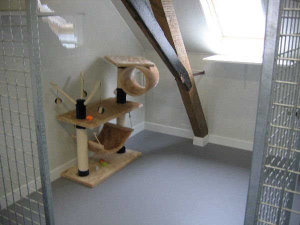 4) "paardenstal": als laatste uitbreiding in 2008 hebben we de oude paardenstal omgebouwd tot een afzonderlijk pension met 2 grote rennen. Deze ruimte is niet verwarmd en wordt dan ook enkel gebruikt in de zomermaanden. De rennen hebben uitzicht op onze binnenkoer en zijn ook geschikt voor grotere kattenfamilies.